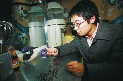 陳寅嵩展示他購(gòu)買到的哥倫比亞咖啡豆。記者 張曉 攝