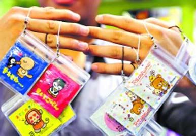 這些安全套有些是包裝上只有圖畫標識,沒有品牌名、廠家和保質(zhì)期等信息的“三無產(chǎn)品”。店主說,只要在安全套外包裝的邊緣上打個洞,穿上掛繩,就能將其做成手機繩或者各類背包的掛飾。而有的安全套的外包裝上還印著“御守”二字,系上細繩和小鈴就被當成“護身符”出售,不同生肖、星座甚至都有各自相應的款式。一問之下,這些安全套掛飾每個售價在20~25元左右,身價比平時足足“飆升”了至少5倍。