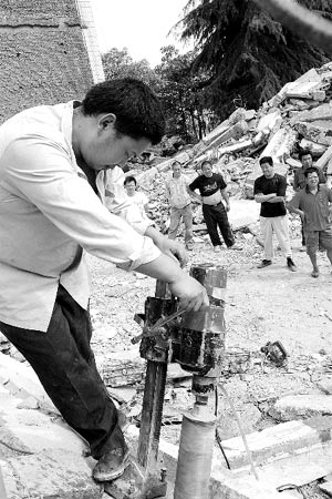 家長們很不理解,大聲質(zhì)問:“為什么不透露單位名稱?我們怎樣得到檢測結(jié)果?”“我們是四川禾力建設(shè)工程質(zhì)量檢測有限公司的。”工作人員忙說。該公司另一組取樣人員,正在對綿竹市幾所學(xué)校的建筑廢墟進(jìn)行取樣。隨著機(jī)器的轉(zhuǎn)動,一個個標(biāo)本從大梁中取出,他們在樣本上標(biāo)注上日期和地址等信息。
