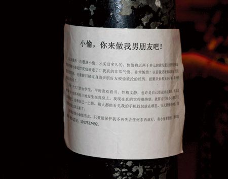 7月14日晚,南寧市朝陽廣場出現(xiàn)了兩張離奇的“征男友”小廣告,小廣告竟公然宣稱“小偷,你來做我男朋友吧”。在張貼小廣告之前,該女子曾在南國早報網(wǎng)論壇發(fā)帖,公布了她的這一想法,記者也曾與該女孩聯(lián)系,了解她此舉的原因。