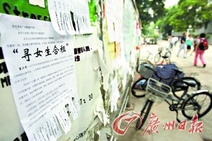記者在中大校園內(nèi)學(xué)五飯?zhí)玫墓鏅谏希N滿各種各樣的“求租”、“出租”廣告,在該學(xué)校附近城中村和小區(qū)街道的墻上則也隨處可見(jiàn)“臨時(shí)房屋出租”的廣告,沿主要街道兩側(cè),幾乎每個(gè)店鋪門(mén)前都立有醒目的臨時(shí)房屋出租廣告牌。