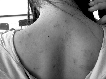 剛開學不久,四川省弘博中等專業(yè)學校新生羅珊只是身上少數(shù)部位出現(xiàn)了紅疙瘩,她以為是被蚊子叮咬也就沒放在心上?筛袅藥滋鞂嬍依锏8名同學都陸續(xù)長滿了“紅包包”,大家才開始著急起來!疤貏e是襠部、腿部等隱秘部位,一出汗又痛又癢,又不方便撓!迸⒂行┎缓靡馑嫉卣f。記者見到女孩背部紅了一片,癥狀較輕的脖子竟已經(jīng)被撓壞。因為學校為封閉式管理,學生們并沒有到醫(yī)院醫(yī)治,只到衛(wèi)生站診治了一下或僅是簡單地涂了些外用藥。