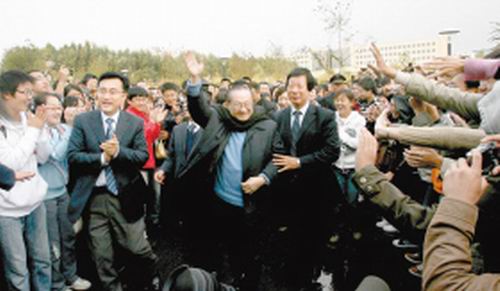 金庸在校園里向?qū)W生揮手致意 記者 李洪亮 攝