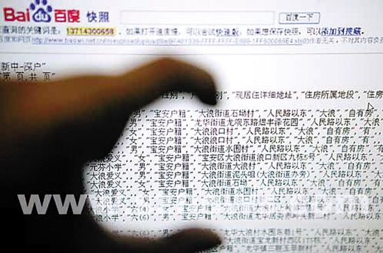 帶著滿腹疑問,沈女士某日晚間上網(wǎng)時嘗試用搜索引擎查找與自己手機(jī)號碼相關(guān)的信息。在“百度”上出現(xiàn)的搜索結(jié)果,其子小圳的姓名、學(xué)校、班別、性別、詳細(xì)住址與家長聯(lián)系電話便一覽無余。再打開“鏈接”,一個名為“××中學(xué)2008年××××錄取名單”的表格便出現(xiàn)在網(wǎng)頁上,讓她吃驚的是,按照表格上的分類,除了之前所看到的信息外,甚至還有該學(xué)生是否屬于獨生子女、家中是否擁有房產(chǎn)等資料。