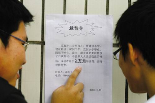 “陪孩子吃、住、讀書,最關(guān)鍵的是能扭轉(zhuǎn)孩子自我封閉的性格,成功者給予2萬(wàn)元陪讀費(fèi)……”昨日(10月23日),一則被同學(xué)們視為“天價(jià)”家教陪讀的“懸賞令”出現(xiàn)在工商大學(xué)校園內(nèi)。懸賞令發(fā)布者稱,因自己拒絕買電腦,上六年級(jí)的兒子3個(gè)月不和她說(shuō)話了。如今自己怎么彌補(bǔ)都無(wú)法扭轉(zhuǎn)孩子的倔脾氣,因此想給孩子找個(gè)陪讀,改變孩子的性格。