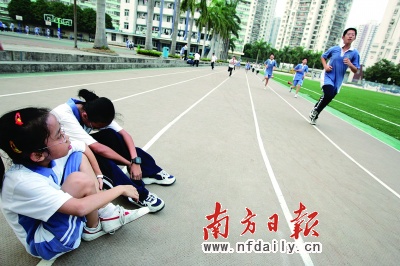 據(jù)氣象部門預報,深圳昨天晴間多云,東北風2級,氣溫24—31℃。下午5時,實驗學校初中部的250米環(huán)形跑道上,初一(十)班的同學們正氣喘吁吁地跑步,隊伍有些稀稀拉拉。幾圈下來,不少學生的后背已經(jīng)濕透。一些剛跑完的學生已累得說不出話來,有些干脆一屁股坐在了地上。
