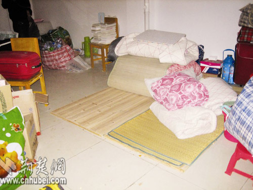 記者程翔報(bào)道:昨晚,湖北經(jīng)濟(jì)學(xué)院眾多學(xué)生因無(wú)床可睡,只好打地鋪度過(guò)漫漫寒夜!澳憧,這就是我們的寢室,床都被拆走了!弊蛲7時(shí)30分許,一名女學(xué)生指著一片狼藉的宿舍對(duì)記者如是說(shuō)(如上圖)。據(jù)她介紹,宿舍住的是該校會(huì)計(jì)學(xué)院自考班大二的學(xué)生。大一的時(shí)候,她們住在東湖邊的濱湖校區(qū)。今年9月,學(xué)校下發(fā)通知,稱已在該校大門(mén)對(duì)面商業(yè)街旁修好了幾棟宿舍,讓她們搬過(guò)去。