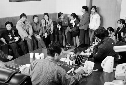 職工們圍坐在馬院長(zhǎng)辦公室討要工資。記者 翟小雪 攝