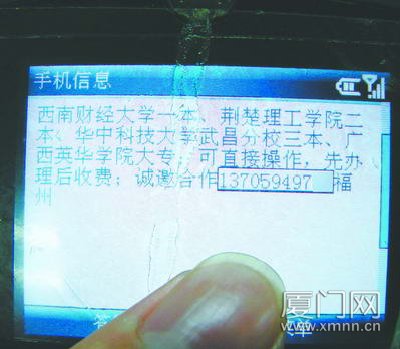 林老師在本市某中學(xué)任教,昨日10時許,他突然收到一條陌生號碼發(fā)來的短信。上面稱:西南財經(jīng)大學(xué)一本、某理工學(xué)院二本、某科技大學(xué)武昌分校三本……可直接操作,先辦理后收費(fèi)。