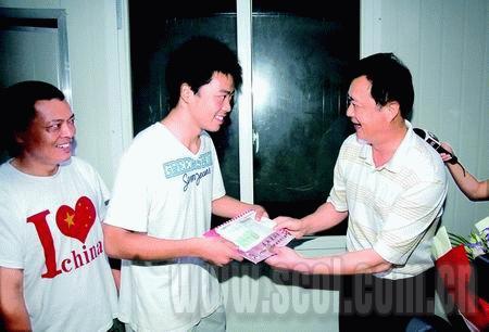 “祝賀你!通過(guò)自己的努力即將成為一位民航飛行員,愿你越飛越高!”昨日上午10點(diǎn),當(dāng)身高近1.8米、家住都江堰胥家鎮(zhèn)大林村五組的易爽,用顫抖的雙手從中國(guó)民航飛行學(xué)院黨委書(shū)記朱勇手中接過(guò)裝有自己錄取通知書(shū)的信封時(shí),現(xiàn)場(chǎng)閃光燈立刻閃成一片。與通知書(shū)同時(shí)遞到易爽手中的還有一束鮮艷的百合花和1000元愛(ài)心助學(xué)金。這也是我省08年高考提前批錄取工作正式開(kāi)始后,由省招辦發(fā)出的第一份高考錄取通知書(shū),而易爽則是我省高考普通類(lèi)招生第一位拿到大學(xué)錄取通知書(shū)的考生。