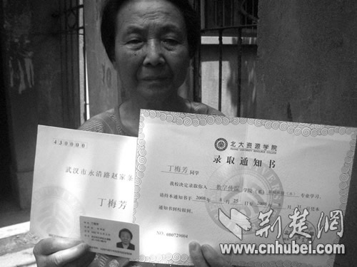 昨日(8月5日,下同)上午,家住漢口永清街趙家條的丁梅芳老太向記者展示了這封標(biāo)稱“北大資源學(xué)院(以下簡稱北資院)”,在8月3日寄達(dá)的錄取通知書。記者看到,該錄取通知書上寫著:“丁梅芳同學(xué),我校決定錄取你入數(shù)字傳媒學(xué)院系新聞傳播(本)專業(yè)學(xué)習(xí),請持本通知書于2008年8月25日……到校報(bào)到!