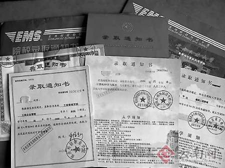 小林向記者出示了6份錄取通知書(shū),這些學(xué)校分布北京、重慶、廣東等省市,有的通知書(shū)采用EMS特快專遞,有的是普通平信匯來(lái)的。錄取通知書(shū)也是各式各樣,紙張粗糙,還附有學(xué)校宣傳冊(cè)或是培養(yǎng)合同……看著這些通知書(shū),小林卻高興不起來(lái):高考成績(jī)僅上?品?jǐn)?shù)線,卻收到6家學(xué)校發(fā)來(lái)的通知書(shū),好幾家錄取的還是本科專業(yè)。這些學(xué)校哪個(gè)是真的?哪個(gè)值得信賴可以去就讀?