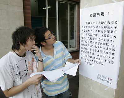 圖片說明:師大錄取通知書發(fā)現(xiàn)造假,兩名學生正在了解告示相關(guān)內(nèi)容。