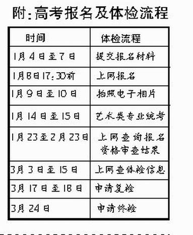 2008年高考報(bào)名時(shí)間為1月18日-23日,2009年高考報(bào)名時(shí)間為1月4日-8日。省考試局稱,報(bào)名時(shí)間之所以提前,是因?yàn)榻衲甏汗?jié)來得早,教育部要求各省必須在春節(jié)前完成藝術(shù)專業(yè)統(tǒng)考工作。