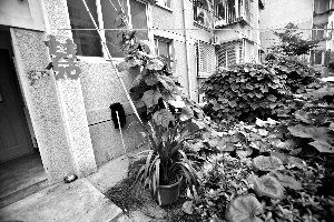近日,在朝陽區(qū)東壩家園,居民在綠地上種的南瓜秧已經(jīng)長到一樓的陽臺上。本報記者 王貴彬 攝
