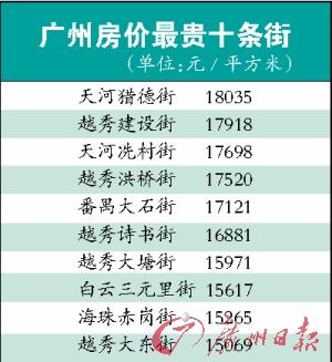 從廣州市各街道一手住房備案均價(jià)情況表可以看到,廣州樓價(jià)最高的10條街的均價(jià)起價(jià)是1.5萬元/平方米,最高的為天河獵德街均價(jià)為18035元/平方米。