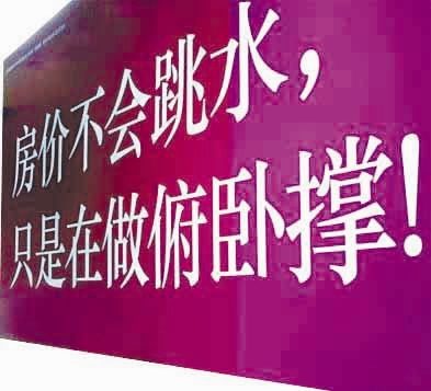 “原來‘俯臥撐’也能這樣做。”在街對(duì)面,一位年輕男子笑著說:“這是什么意思呢?”一對(duì)年輕情侶邊走邊看著街對(duì)面這幅廣告,“什么意思?寫得很明白!就是房?jī)r(jià)不會(huì)跳水啊。”小伙對(duì)女友說:“什么意思?就是房?jī)r(jià)不會(huì)跌唄!碑(dāng)記者打通熱線電話時(shí),售樓小姐非常干脆地答道,廣告就是想通過表達(dá)這個(gè)意思,來吸引市民購(gòu)房,而不要再觀望!澳壳暗臉莾r(jià)就像做俯臥撐一樣,僅是短暫地俯下去,而不是一味地向下跌,以后還會(huì)有上升的空間,因此房?jī)r(jià)是在一個(gè)正常的范圍內(nèi)浮動(dòng)。”該樓盤企劃部的一位負(fù)責(zé)人解釋。