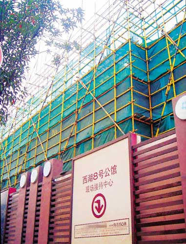 在吳山廣場邊上的四宜路上,記者找到了這個(gè)占地僅5980平方米的樓盤。因?yàn)榕R近西湖,有限高規(guī)定,所以在一片二手房簇?fù)碇械奈骱?號公館并不是那么顯眼。整個(gè)樓盤僅有兩幢房子,而且中間還隔著一幢破舊的樓房,看起來,樓盤的小景觀并不是特別理想。