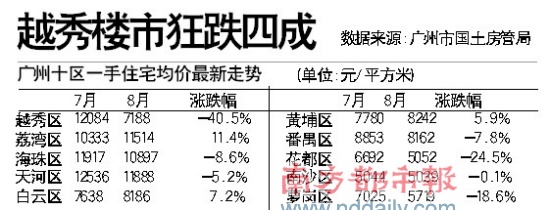 廣州越秀區(qū)房?jī)r(jià)大跳水,一手住宅均價(jià)從今年7月的12084元/平方米猛跌至7188元/平方米。廣州市國(guó)土房管局調(diào)查指出,越秀區(qū)房?jī)r(jià)大幅下降是由兩個(gè)低價(jià)樓盤(pán)的集中交易造成的,專家稱可能涉及內(nèi)部交易。而廣州市日前公布的最新房地產(chǎn)市場(chǎng)分析報(bào)告顯示,廣州全市十區(qū)8月一手住宅均價(jià)小幅下降至9078元/平方米。