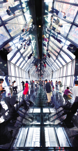 再轉(zhuǎn)乘專用電梯,終于來(lái)到位于100層、距地面474米處的“觀光天閣100”。這是目前世界最高的觀光設(shè)施。55米長(zhǎng)的懸空觀光長(zhǎng)廊,其實(shí)就是大廈頂部倒梯形風(fēng)洞的上檐,三角形屋頂鑲滿玻璃鏡面,光影折射夢(mèng)幻迷離。長(zhǎng)廊地面鋪有3條透明玻璃地板,可直接俯瞰腳底下陸家嘴金融貿(mào)易區(qū)川流不息的車流、芳草如茵的綠地及連綿的樓宇,對(duì)膽量是一種小小的考驗(yàn)?zāi)!難怪在轉(zhuǎn)乘電梯時(shí),顯示屏播放的內(nèi)容為:玻璃地板的安全性能。