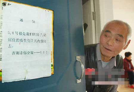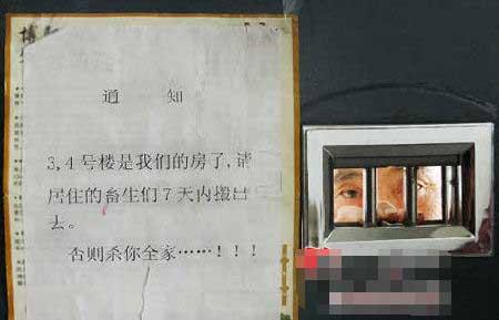 該小區(qū)物業(yè)辦工作人員說(shuō),十天前,小區(qū)里突然出現(xiàn)了十幾張通知,落款未寫(xiě)單位,但內(nèi)容很恐怖:如果三、四號(hào)樓的住戶不搬家,就殺他全家!罢麄(gè)小區(qū)的人都人心惶惶的,特別是三、四號(hào)樓的200多個(gè)住戶,日夜守在家里,生怕沒(méi)人的時(shí)候房子被人強(qiáng)占。”該工作人員說(shuō)。