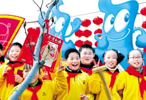 “2010年,請(qǐng)到中國(guó)來(lái)!”今天上午,寶山區(qū)和衷小學(xué)的學(xué)生們?cè)诎子裉m樹上掛一張張世博心愿卡,與“海寶”一起喜迎世博。今天是元宵節(jié),恰逢上海世博會(huì)開幕倒計(jì)時(shí)800天,寶山區(qū)炮臺(tái)灣濕地森林公園里彩旗招展、鑼鼓喧天,“迎世博紀(jì)念林”種下第一批白玉蘭。