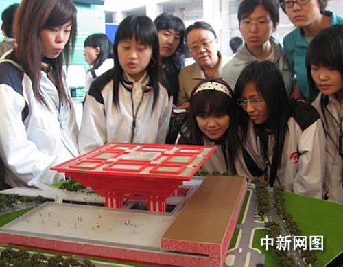 二0一0年上海世博會(huì)中國(guó)國(guó)家館外觀“東方之冠”的模型前,來自石家莊鐵道學(xué)院的大學(xué)生們對(duì)這個(gè)類似中國(guó)古代官帽的建筑興趣頗濃。