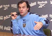 不過(guò),這似乎并不影響他的執(zhí)教能力。正是在他的帶領(lǐng)下,阿根廷近年來(lái)向世人呈現(xiàn)了一場(chǎng)場(chǎng)精彩的攻勢(shì)足球?梢哉f(shuō),他瘋狂的3-3-3-1攻擊陣容,已經(jīng)深入人心。對(duì)于2002年的世界杯目標(biāo),他的回答很簡(jiǎn)單:不但要奪取世界杯,而且還要贏得好看。