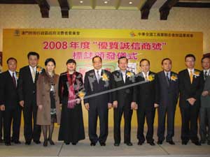 澳門(mén)消委會(huì)與全國(guó)工商聯(lián)旅游業(yè)商會(huì)聯(lián)合頒發(fā)下年度“誠(chéng)信店”優(yōu)質(zhì)標(biāo)志儀式,于19日中午12點(diǎn)在澳門(mén)文華東方酒店舉行。澳門(mén)經(jīng)濟(jì)財(cái)政司司長(zhǎng)譚伯源,全國(guó)工商聯(lián)旅游業(yè)商會(huì)會(huì)長(zhǎng)王平、第一副會(huì)長(zhǎng)王敏剛、副會(huì)長(zhǎng)何超瓊、蘭世立、穆民、秘書(shū)長(zhǎng)王永強(qiáng),澳門(mén)消委會(huì)委員及多名行業(yè)商會(huì)代表出席。