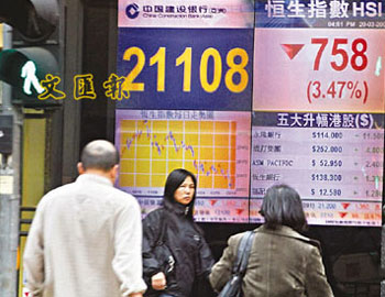 中新網(wǎng)3月21日電 據(jù)香港大公報(bào)報(bào)道,環(huán)球商品價(jià)格急跌,引發(fā)亞太區(qū)股市顯著回落,其間港股在金價(jià)油價(jià)商品股拖累下,收市時(shí)跌758點(diǎn),是亞太區(qū)內(nèi)表現(xiàn)最差的市場。分析員指出,恒指50天線在周三已跌穿250天線,不少投資者會(huì)視之為“熊市”的確認(rèn)。