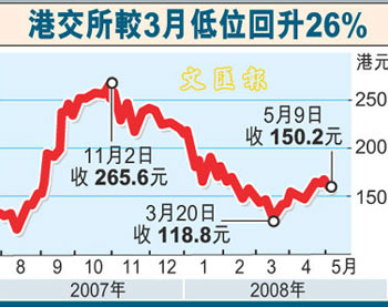 中新網(wǎng)5月13日電 據(jù)香港文匯報報道,市場分析預計,周三將公布首季業(yè)績的港交所,2008年首季凈利料將強勁增長,凈利料將同比增長56%至84%至14.4億元至17億元。