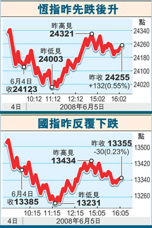 國指跌30點報13355點,市場再次炒作中石化可能將上石化及儀征私有化,消息刺激上石化最多升10%,收報3.4元,升7.2%。儀征亦曾升6.8%,收報1.85元,升5%。中石化則最多升5%,收報8.02元,升4.4%。