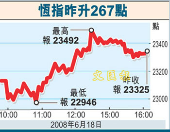 中新網(wǎng)6月19日電 據(jù)香港文匯報報道,港股18日在內(nèi)地股市單日轉(zhuǎn)向帶動下,加上市場憧憬成品油價格改革會有進(jìn)展,刺激中石化及中石油勁升,補(bǔ)倉盤涌現(xiàn),恒指收市報23325點(diǎn)。業(yè)者認(rèn)為,若內(nèi)地股市買盤動力持續(xù),中資股在恒指比重已超過5成,恒指也可望受惠重上24000點(diǎn)關(guān)。