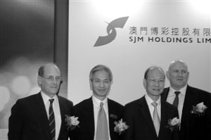澳門博彩控股行政總裁蘇樹(shù)輝、營(yíng)運(yùn)總裁吳志誠(chéng)、業(yè)務(wù)發(fā)展總裁麥輝霆、財(cái)務(wù)總監(jiān)麥文彬25日在香港香格里拉酒店介紹上市程序。