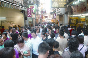 圖:澳門大三巴手信街?jǐn)D滿游客。(圖片來源:澳門日報)