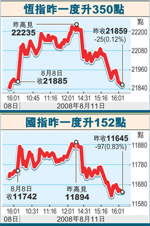 中新網(wǎng)8月12日電 據(jù)香港文匯報報道,受隔夜美股造好及內(nèi)地股市大挫影響,港股11日先升后跌,大市開市高開135點,但午市受A股大跌逾5%影響,收市倒跌25.87點,收報21859.34點,成交總額僅575.90億元。市場人士指,市場關(guān)注內(nèi)地的通脹數(shù)據(jù),港股后市料反復(fù),恒指或下試21500點。
