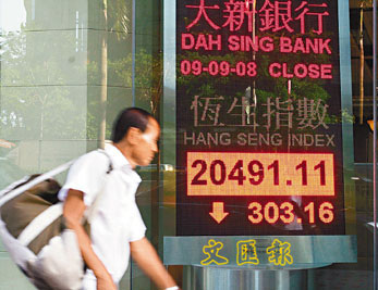 港股9日未能延續(xù)周一勁升860點(diǎn)的強(qiáng)勢(shì),就算美股高收近300點(diǎn),恒指也跟隨亞洲區(qū)股市下跌,剛開市已跌355點(diǎn),最多跌近500點(diǎn),下午跌勢(shì)喘定,收?qǐng)?bào)20491點(diǎn),跌303點(diǎn),成交額比周一大減200億元至479.5億元。