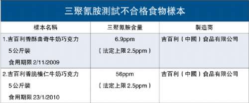 吉百利香脆榛仁牛奶巧克力的三聚氰胺含量為百萬分之五十六,較法定上限的百萬分之二點五,超出二十一點四倍;另一款吉百利香酥曲奇牛奶巧克力三聚氰胺含量為百萬分之六點九,超標(biāo)一點七六倍。