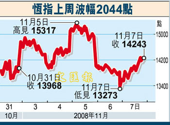 葉尚志估計(jì),港股在10676點(diǎn)見底后的第一波反彈,已在周三完成,當(dāng)日恒指曾見過15318點(diǎn),后市料進(jìn)入反復(fù)整固階段,上下范圍在12500至15000點(diǎn)間,未來(lái)焦點(diǎn)則會(huì)放在將公布的內(nèi)地CPI和PPI數(shù)據(jù),以及本月15日舉行的G20首腦會(huì)議。