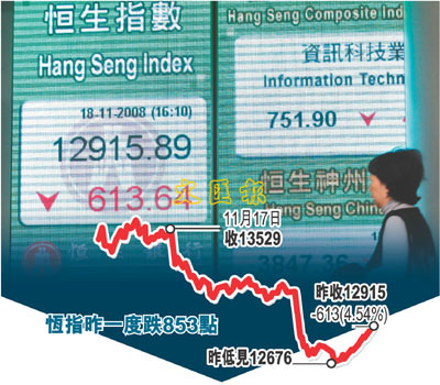 美國(guó)就業(yè)市場(chǎng)憂慮加深,美股跌223點(diǎn),令18日外圍股市也全線偏軟,連內(nèi)地上海A股也要急挫6.3%,港股低開231點(diǎn)后持續(xù)下跌,下午恒指隨A股弱勢(shì)曾經(jīng)跌超過850點(diǎn),低見12676點(diǎn),尾市跌幅略為收窄,但仍守不住13000點(diǎn)大關(guān),恒指全日收12915.8點(diǎn),跌613.6點(diǎn),成交448億元。