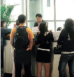 受影響旅客在亞洲航空公司柜位查詢航班情況。(圖片來源:澳門日報)