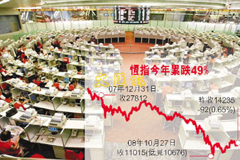 恒指30日收?qǐng)?bào)14235點(diǎn),今年以來(lái)計(jì),跌幅達(dá)49%或13600點(diǎn),以點(diǎn)數(shù)計(jì)是歷年最大,以百分比計(jì)是歷年第二大。受環(huán)球金融海嘯拖累,年內(nèi)市況極為動(dòng)蕩,連強(qiáng)積金也大虧,無(wú)論大戶散戶,也不論有否投資股票,人人損失慘重。