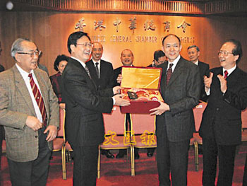 中總霍震寰會(huì)長(zhǎng)以及林廣兆、張成雄、陳幼南、林銘森副會(huì)長(zhǎng)及多位常董、會(huì)董與來(lái)賓座談,并設(shè)晚宴歡迎李春明副省長(zhǎng)一行。霍震寰會(huì)長(zhǎng)與林廣兆副會(huì)長(zhǎng)均表示,中博會(huì)是信息交流的重要平臺(tái),是世界了解中部地區(qū)發(fā)展的窗口,香港工商界都十分重視。中總長(zhǎng)期以來(lái)與香港工商界以及世界華商保持緊密聯(lián)系,可以協(xié)助湖北省政府發(fā)布中博會(huì)信息。