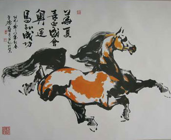 此畫(huà)描繪了一匹奔騰向前的駿馬,頗具“馬踏飛燕”雄風(fēng)。繪畫(huà)的技法雖屬中國(guó)筆墨寫(xiě)意,但馬的比例結(jié)構(gòu)卻是精準(zhǔn)的良馬相,顯示出作者廣博的馬學(xué)知識(shí)及深厚的藝術(shù)功力。畫(huà)面行書(shū)題款為“華夏喜迎盛會(huì),奧運(yùn)馬到成功”,表達(dá)了中國(guó)人民此時(shí)此刻的美好心愿。馬身上的花斑中,細(xì)看有一幅中國(guó)地圖,更是明白無(wú)誤地象征著中華騰飛之意。