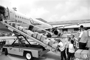 五月十八日,澳門救助四川地震災(zāi)民的首批救災(zāi)物資在澳門國際機(jī)場裝倉啟運(yùn)。由澳門紅十字會(huì)及澳門街坊總會(huì)認(rèn)購的這批救災(zāi)物資包括奶粉、毛毯、食品、電筒等災(zāi)區(qū)急需的物資共十二噸。這些物資由澳門航空公司免費(fèi)運(yùn)送,將于當(dāng)日下午抵達(dá)成都雙流國際機(jī)場。 中新社發(fā) 史利 攝