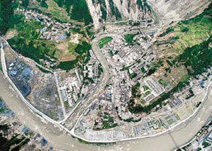 傍晚5時30分,飛機飛抵汶川縣映秀鎮(zhèn)上空,記者在機組人員的幫助下,打開機艙門,向外張望,發(fā)現(xiàn)整個鎮(zhèn)子已經(jīng)變?yōu)橐黄瑥U墟,只有少數(shù)的工廠外墻還在堅強地佇立著!斑@里是地震的中心地帶,相反汶川縣城卻沒有那么嚴重的,只是道路不通影響救援而已!