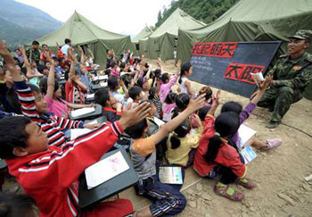 朗朗的讀書(shū)聲,在平日可能算不上是什么,但自災(zāi)區(qū)里傳出,卻就是撫慰受創(chuàng)的心靈的一帖最佳良藥。地震過(guò)后的一星期,都江堰聚源中學(xué)復(fù)課,地點(diǎn)不是在倒塌了的校舍,而是在聚源小學(xué)操場(chǎng)的臨時(shí)教學(xué)點(diǎn),來(lái)上課的學(xué)生有100多人,第一課上的是心理輔導(dǎo)。