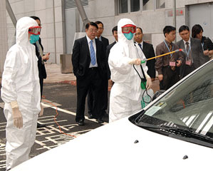 演習(xí)模擬兩地衛(wèi)生部門的人員,在深圳灣口岸截查入境車輛時,發(fā)現(xiàn)有乘客出現(xiàn)發(fā)燒病征,懷疑感染禽流感。