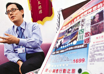 中旅社業(yè)務(wù)部副總經(jīng)理吳熹安表示,四川省旅游局宣布部分旅游景點恢復(fù)接待游客,故集團實時推出低至7折、團費由1699元起的四川4天優(yōu)惠團,另推出團費2799元的5天愛心關(guān)懷團,行程除了傳統(tǒng)的樂山、峨眉山外,亦安排團員參觀地震災(zāi)區(qū)民眾暫住的“溫馨家園”,讓團員向四川人民送暖。