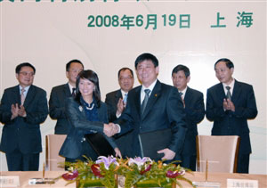 在經(jīng)濟財政司司長譚伯源及上海市委常委、上海市常務(wù)副市長、2010年上海世博會執(zhí)行委員會常務(wù)副主任楊雄等的見證下,上海世博會澳門籌備辦公室主任楊寶儀及上海市副秘書長、上海世博局局長洪浩代表雙方簽署協(xié)議。